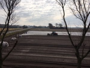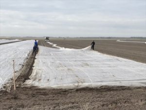 Dachten we dat de winterkou achter de rug was, ... komt deze toch nog om de hoek kijken met venijnige wind en temperaturen onder nul. En dus is het schakelen voor de agrariër. De bollen die net geplant zijn, hebben nog geen worteltje, en kunnen geen vorst hebben. Dus tijd om inventief te zijn. De gaasdoeken worden uit de winterstalling gehaald, met man en macht worden ze over de reeds geplante bedden heen gelegd, en nu maar hopen dat de freesia knollen het overleven.