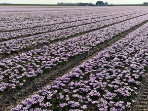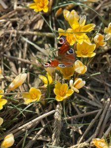 Naast de bijen zagen we ook al dat er vlinders te zien waren. Het is de dagpauwoog (inachis io), een veelvoorkomende en prachtige vlinder. Ook de vlinder is op zoek naar nectar. De vroege bloei van de krokussen biedt een van de eerste voedselbronnen voor vlinders in het voorjaar, nadat ze uit hun winterslaap komen. De bloemen zijn rijk aan nectar, wat essentieel is voor vlinders die hun energie uit deze suikerrijke vloeistof halen. Daarnaast kunnen vlinders ook de bloeiende krokussen gebruiken voor het leggen van eitjes, vooral als ze een geschikte omgeving en planten in de buurt vinden die de larven kunnen voeden. De krokussen staan nog lang op de velden, ze bloeien hier helemaal uit, het lof gaat afsterven, en pas in juni zullen de kleine bloembollen worden geoogst.