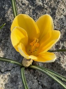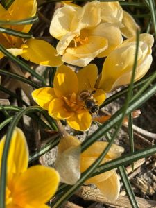 Bijen zijn vaak de eerste insecten die op zoek gaan naar nectar zodra de lente begint, vooral als de eerste bloemen zoals krokussen beginnen te bloeien. Doordat het weer goed is, voelt de bij dat hij erop uit moet. Daarnaast staan er vlak bij deze percelen met krokussen, diverse bijenkasten van de lokale imker Regina. https://imkerijregina.nl/ De bloeiende krokussen bieden de bij een van de eerste voedselbronnen van het jaar. De bij vliegt van bloem naar bloem en verzamelt nectar met zijn lange tong. Tegelijkertijd bestuift de bij de bloemen, wat betekent dat ze bijdragen aan de voortplanting van de planten. Terwijl ze nectar halen, komen ze in contact met de stuifmeelkorrels van de bloemen, die ze vervolgens naar andere bloemen dragen, waardoor de bloemen worden bevrucht.