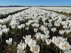 29 maart 2021De temperaturen zijn nog vrij laag, maar wanneer de thermometer dubbele cijfers gaat tonen, dan explodeert de Kop van Noord-Holland. Het grootst aaneengesloten bloembollengebied van de wereld staat op springen. Het is wachten op explosie van kleur, een lappendeken van verschillende kleuren. Op dit moment is het nog guur en koud, is het nog werken met mutsen op, winterlaarzen aan, en ontbreken ook de handschoenen nog niet. Toch geven de krokussen al aan dat Pasen in aantocht is. Mooie heldere kleuren piepen door het winterse strolaagje heen.