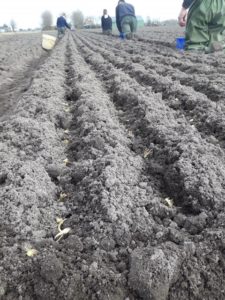 9 april 2018'Koning Winter' is nu definitief weggedrukt door 'Vrouwtje Voorjaar', en dus volle bak aan de gang met plantwerkzaamheden. Op de percelen 'thuis', dat wil zeggen op de gronden in het Noordelijk Zandgebied worden eerst de lelies geplant. Veelal geheel machinaal, maar zo nu en dan is er toch nog een ouderwets klusje. Op de knietjes en met de hand weefseltje planten: koud, niet altijd leuk, spierpijn, maar als 's middags de klus samen is geklaard, zijn we trots en overheerst het goede gevoel!