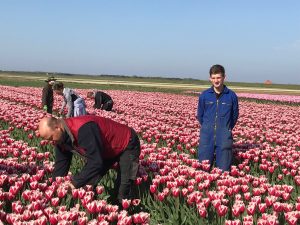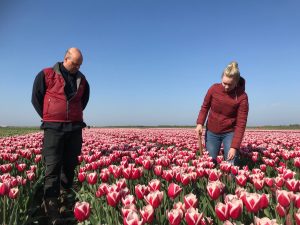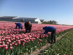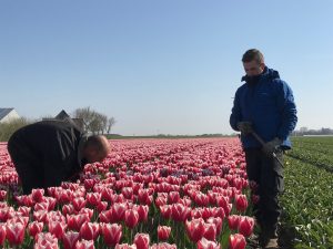13 mei 2019Wie heeft het? Wie mag hier van genieten? Wie mag hier in werken? Wij, mogen dat, en wij genieten ervan. Ja, het is veel werk want elk 'bed' met tulpen wordt minimaal 3 x gecontroleerd. De eerste keer lopen we door de velden als er nog niets bloeit. Op zoek naar virus of afwijkende planten tussen de tulpenvelden. De tweede controle betreft op de 'bloei'. Is de tulp 'kleur-echt', zit er geen 'verloping' in, ofwel controle om de tulp 'raszuiver' te houden. De derde keer is wanneer de bloemkoppen eraf gehaald zijn. Dit tulpenkoppen gebeurd om alle energie naar de groei van de bloembol te laten gaan, en niet naar de bloem. We zijn tenslotte: bloembollenkwekers! Onze inkomsten komen uit de bloembollen. Ondanks dat het veel fysiek werk is, beamen we allemaal dat het prachtig werk is, en dat de prachtige velden zo bewonderd worden door de vele toeristen, zien wij als compliment voor onze inzet.