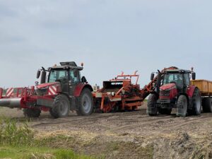 12 juli 2021Het prachtige oer-Hollandse product, de tulp, is rijp om gerooid te worden. En dus moeten ze uit de grond, dit tijdstip van rijping mikt best nauw, dus er is wat haast geboden. De omstandigheden worden beter. Door de grote hoeveelheid neerslag van 2 weken terug, was de opstart van rooien lastig. Te natte omstandigheden zorgden voor een stroeve start waarbij veel zand werd meegerooid, waardoor er meer transport bewegingen benodigd zijn, en het dus langer duurt voordat dezelfde hoeveelheden gerooid product in de schuren staan. Dit meegerooide zand wordt overigens nu tijdelijk opgeslagen en na de rooiperiode weer teruggebracht naar de percelen. Nadat de tulpenbollen in de schuren aangekomen zijn, worden ze gespoeld, gesorteerd op maat en gedroogd. Dit neemt ongeveer een 5 werkdagen in beslag. Daarna zullen ze de over de verwerkingslijn gaan waar ze gepeld, gecontroleerd en verpakt worden. Dit verpakken gaat in hoeveelheden van ca. 500 stuks per krat. Waarna ze binnen 3 dagen vervoerd zullen worden naar de diverse kopers.