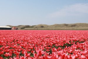 De warmste 22 april ooit, kopte de nieuwsberichten. Sinds 1901 is het niet zo warm geweest!  En er toch niet mooier dan in korte broek bloeiende bollenvelden bekijken! Volop toerisme die duidelijk genieten van de kleurrijke velden. De geplaatste waarschuwingsborden met gelieve wel genieten van de bloeiende velden, maar gelieve niet in de velden gaan, doen hun werk. Het grootste deel van de mensen kijkt, fotografeert en geniet vanaf het kop-end.