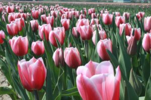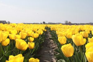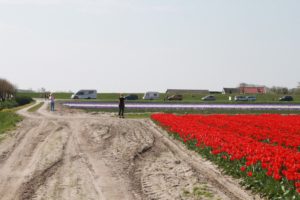 De warmste 22 april ooit, kopte de nieuwsberichten. Sinds 1901 is het niet zo warm geweest!  En er toch niet mooier dan in korte broek bloeiende bollenvelden bekijken! Volop toerisme die duidelijk genieten van de kleurrijke velden. De geplaatste waarschuwingsborden met gelieve wel genieten van de bloeiende velden, maar gelieve niet in de velden gaan, doen hun werk. Het grootste deel van de mensen kijkt, fotografeert en geniet vanaf het kop-end.