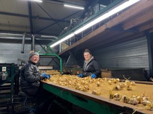 Het plantgoed wordt opgeschoond, en verder gesorteerd naar bolgrootte. Zodat tijdens het plantproces de verschillende maten niet door elkaar zitten. Dit heeft als voordeel dat tijdens het planten van de lelies, in de maanden maart - april, de plantmachine heel nauwkeurig afgesteld kan worden op de maat, en de hoeveelheid bloembollen per akker precies ingesteld kan worden. Als er te veel afwijking zit in de maten, kan de plantmachine dit niet met deze precisie te doen. Kortom alle arbeid die we er nu insteken, komt ten goede tijdens het planten, wat ook weer voorspoedig werkt als de bollen gerooid moeten worden.