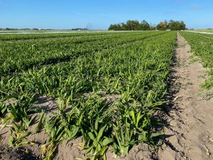 Daarnaast is het tijd om de kwaliteitscontrole van de freesia's te gaan doen. De freesia's zijn in maart in de grond gegaan, en het gewas komt nu mooi op. Alle freesia's worden bij ons onder een 'gaasdoek' geteeld. Dit om luis geen kans te geven. Het groeiende gewas neemt het doek mee omhoog. Deze week zijn alle doeken er even af geweest, om de kwaliteit van het gewas te bepalen.