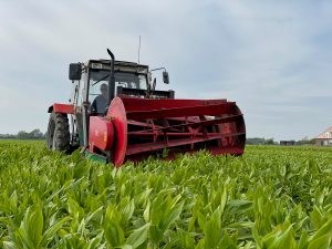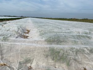 Daarnaast is het tijd om de kwaliteitscontrole van de freesia's te gaan doen. De freesia's zijn in maart in de grond gegaan, en het gewas komt nu mooi op. Alle freesia's worden bij ons onder een 'gaasdoek' geteeld. Dit om luis geen kans te geven. Het groeiende gewas neemt het doek mee omhoog. Deze week zijn alle doeken er even af geweest, om de kwaliteit van het gewas te bepalen.