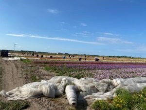 Dat er onkruid groeit is natuurlijk vanzelfsprekend, maar deze nemen wel de ruimte in van de freesia knol. Hierdoor kan de groei van deze knol belemmerd worden, en dat is natuurlijk niet de bedoeling. Deze onkruiden kunnen bestreden worden met chemische middelen, maar als er een alternatief is, zullen wij dit zeker doen, zoals vanochtend. Aan het einde van de dag zijn de percelen weer mooi opgeschoond en verdwijnen de freesia bloemen weer onder doek. Dit doek is een bescherming tegen luis en deze teelt is puur voor de knollen, en wordt verder niets met de bloemen gedaan.