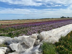 Dat er onkruid groeit is natuurlijk vanzelfsprekend, maar deze nemen wel de ruimte in van de freesia knol. Hierdoor kan de groei van deze knol belemmerd worden, en dat is natuurlijk niet de bedoeling. Deze onkruiden kunnen bestreden worden met chemische middelen, maar als er een alternatief is, zullen wij dit zeker doen, zoals vanochtend. Aan het einde van de dag zijn de percelen weer mooi opgeschoond en verdwijnen de freesia bloemen weer onder doek. Dit doek is een bescherming tegen luis en deze teelt is puur voor de knollen, en wordt verder niets met de bloemen gedaan.