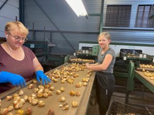 13 juli 2020Midden in het oogstseizoen, volop bezig met van alles. Strak organiseren en goed structureren, dan kan er veel, en dat gebeurt er dan ook. Natuurlijk zijn we nog tulpen aan het rooien, spoelen, pellen, tellen en afleveren. Daarnaast worden er hyacinten gerooid, er worden narcissen boven gerooid en op-ge-kist. De narcissen worden in de schuur verwerkt en klaar gemaakt voor de afnemers. Het lege land, waar de bloembollen vanaf komen wordt gelijk bewerkt en stuifvrij gemaakt. Maar ook de zomerbloeiers, de freesia's vragen hun aandacht. Het is van belang dat deze onkruid vrij blijven. Dat vuil plukken gebeurt gewoon met de hand, onder het mom van 'vele handen maken licht werk'. Kortom, volle bak aan het werk!