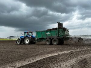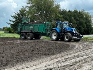 24 juli 2023De voorjaarsbloeiers als krokussen, tulpen en narcissen zijn van het land af, en in de schuur om verwerkt te worden. Tijd om extra aandacht aan het land te besteden. Het gecomposteerde lof wordt samen met de geproduceerde hoeveelheid Bokashi over het land gereden om het te verreiken.