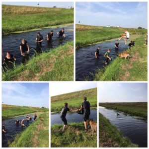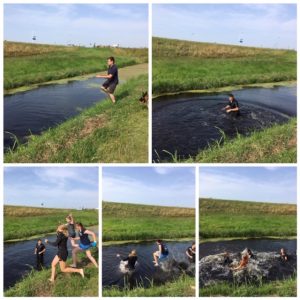 26 juli 2019Zinderend heet is het, en nergens is meer enige afkoeling te vinden als je gewoon aan het werk bent. Wind is er nagenoeg niet, en hoe hou je dan het hoofd koel? Het personeel zag nog maar 1 oplossing: 'de sloot in': zo gezegd, zo gedaan. Sommigen vrijwillig, anderen met iets meer hulp.