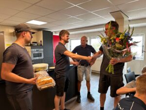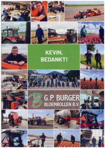 Na ruim 5 jaar bij ons in de bloembollen gewerkt te hebben, gaat Kevin verder in de aardappels. Wij bedanken Kevin voor de jaren dat we samen hebben mogen optrekken, samen bergen werk hebben verzet. Jouw werklust en inzet, humor en lach, en vooral jouw liefde voor de (nieuwe) rooimachine gaan we niet vergeten. Heel veel succes met alles wat in de toekomst op jouw pad komt!