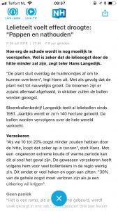 30 juli 2018Zomer 2018 gaat nog voordat augustus is begonnen, de boeken al in als droog en warm. Het effect op de tulpen en narcissenoogst is inmiddels duidelijk, de bollen zijn te kort gegroeid. Gaat ditzelfde gebeuren met de leliebollen. Deze bollen, die in maart zijn geplant hebben nauwelijks hemelwater gehad, of hebben te maken gehad met hoosbuien waarbij in één plons enorm veel viel. Natuurlijk kunnen wij als kwekers beregeningsinstallaties aan zetten, maar het gewone regenwater is vele malen effectiever. Het effect van de droogte is hier en daar als zichtbaar door afstervende percelen lelies, ver voordat dit proces ingezet zou moeten worden. Natuurlijk meten we pas op de streep, ofwel als de lelie oogst ook weer is verwerkt, maar, …. de verwachtingen zijn niet al te best.