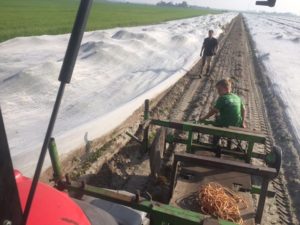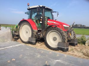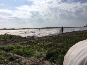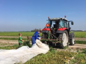 30 augustus 2017Nog een laatste mooie dag voordat er veel neerslag gaat komen. En dus tijd om de freesia doeken op te rollen. Het eerste stapje in het oogst proces van de freesia's. Eerst worden de doeken (die zorgen ervoor dat de freesia luisvrij blijft) verwijderd, vervolgens zal het lof gehakseld worden, en daarna de knollen geoogst. Het oprollen van de doeken is voor de jongste Burger een feest, want als je op zo'n lang doek gaat zitten, en deze wordt automatisch opgerold, is het een soort attractie geworden, dus 'helpen' doen ze graag.