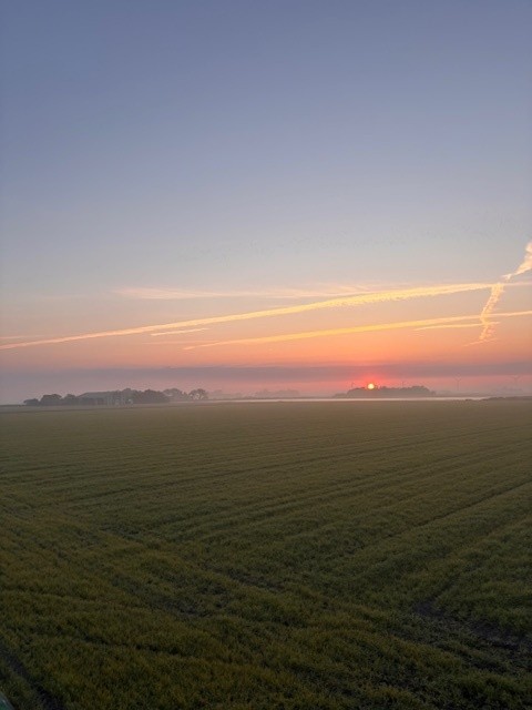 6 oktober 2025De weersomstandigheden zijn alles bepalend in plant- en oogst periodes. Heel stabiel rustig najaar weer is het niet, maar er zijn nog genoeg mogelijkheden om tussen de regen en de najaarsstormen de grond plantklaar te maken en de bollen te planten. Als je dan in de vroege ochtend met een mooie zonsopkomst boven op het dak van een strodek machine mag werken, dan zijn dat wel de geniet momentjes. De bloembollen worden afgedekt met een laagje stro als 'isolatie deken' voor de vorst. De vorst, als die gaat komen, en laten we het hopen (:-))), mag niet te diep de grond in kan trekken, zodat de bloembollen vorstvrij blijven. Voor de natuur, het bodemleven, is het wel fijn als er wat vorst zou komen. Vorst breekt namelijk de bodem open, en verbetert de structuur, tegelijk zullen plagen terug gedrongen worden, zodat een beter natuurlijk evenwicht ontstaat.