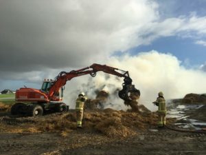 Nog de hele dag is de vrijwillige brandweer bezig geweest de smeulende resten na te blussen, daarbij geassisteerd door een mobiele kraan die het stro uit elkaar kon halen.