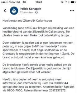 Oplettende voorbijgangers hebben een harde knal gehoord, brand zien ontstaan en ook een auto uit het land zien wegrijden. Daarbij hebben deze personen ook het kenteken kunnen noteren dus is het aan de politie om de puzzelstukjes in elkaar te leggen.