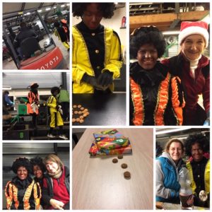 6 december 2018Verrassingsbezoek door twee zwarte pieten in de schuur. Even de gedachten op iets anders focussen, even die glimlach op gezichten toveren. De koffie werd vervangen door warme chocomelk met slagroom, en voor elk personeelslid was er een kadootje. Dank jullie wel zwarte pieten, wij vonden het erg leuk, en het strooigoed was erg lekker.